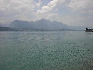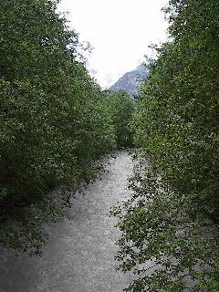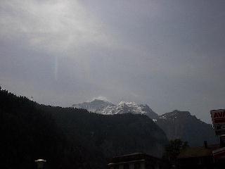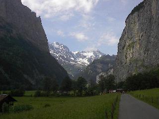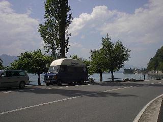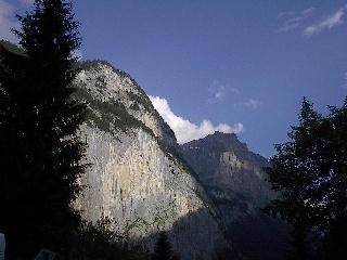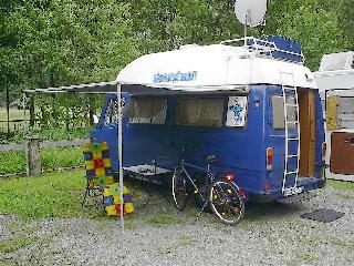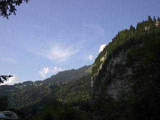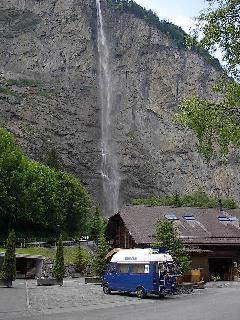 es dann über die Route 6 nach Interlaken. Bei Thun machte ich dann erstmal eine Rast am Thuner See um meinen Füßchen wieder etwas Kühlung zu gönnen. Direkt an dem Parkplatz führte ein Kies-Strand zum See. Ein gutes Stündchen hab ich hier schon verplempert, bevor es dann weiter nach Interlaken ging. Von Interlaken sind es dann nur noch ca. 20Km bis Lauterbrunnen, einem phantastischen Tal zu Füssen der Bergriesen Jungfrau, Mönch und Eiger. Das ganze Tal wird rund um die Uhr von einem leisen aber stetigem Rauschen durchzogen, weil es hier wohl an die 50 Wasserfälle gibt, die die Gletscher der Bergriesen entwässern. Einige dieser Wasserfälle waren dann auch direkt am Campingplatz. Und hier hab ich's mir dann gemütlich gemacht und erstmals die Markise aufgebaut. Und bevor die Frage kommt: Ja, ich bin auch in der Bergwelt mit meinem Drahtesel unterwegs gewesen! Gut, an manchen Stellen bin ich abgestiegen und hab geschoben, aber nur da, wo's wirklich extrem steil bergauf ging!!! Dicht vor der Nase von meinem Schlumpf-Mobil floss übrigens ein noch lauter als die Wasserfälle rauschender Wildbach entlang.