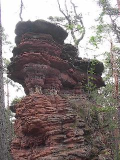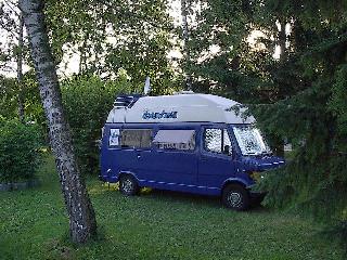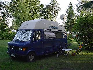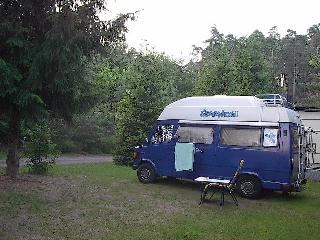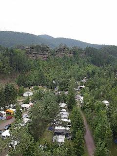 Solche bizarre Felsformationen begegnen einem nur in der Pfalz. Der Blick von ganz oben auf den Platz - wenn man genau hinsieht, kann man im Bild rechts ziemlich genau in der Bildmitte den Schlumpf erkennen... Tjaa, am Freitagmorgen gings dann wieder richtung Heimat *seufz*. Ich kam auch gut voran, nirgends war Stau. Nur der blöde böige Wind, der immer grade dann von vorne kam, wenn es bergauf ging, ärgerte mich ein wenig. Naja, es hätte alles so schön enden können, wenn... ja, wenn ich nicht so vertrauensseelig wäre. Als ich bei Euskirchen vorbei fuhr, stand meine Tankuhr noch auf Viertelvoll (oder -leer). Bei Bergheim kratzte sie so grade am Rand der Reserve. Da dacht ich mir, na prima. Bei Bedburg kann ich tanken. Naja, was soll ich sagen - während die dreiste Tankuhr immer noch etwa die Mitte der Reservemarkierung anzeigte, kam 400m vor der Autobahnausfahrt Bedburg völlig unerwartet das Ende. Ein Ruckeln, ein Seufzen und dann war der Motor aus. Game over. Im Tank: Nichts mehr. Nur ein hohles Echo. Nun ist ja kurz hinter der Ausfahrt Bedburg seit Kurzem eine relativ neue Raststätte. Ich also Warnblinker an, Warndreieck raus und dann: I'm walking... In der Ausfahrt, also nach ca. 400m hält ein Kleinlastwagen und ein korpulenter Südländer fragt, was mit dem WoMo ist. Ich erklärs ihm, er fährt mich zur Raststätte. Boah, das wären doch noch zwei Kilometerchen gewesen... Also, ich danke recht schön, er sacht, er muß sowieso jetzt zurück weil er Bedburg raus wollte, er würd mich wieder mit zurück nehmen. Ich kauf nen Kannister mit 5 Litern Diesel, er fährt mich zurück zur Ausfahrt und läßt mich da wieder raus. Es müßte mehr so freundliche Menschen geben, dann wär die Welt doch noch ein angenehmer Ort... Ich also wieder - diesmal mit Kannister - I'm walking... Immer in der Hoffnung, dass jetzt grade keine kleinen grünen Männchen mit weissen Mützen auftauchen, hab ich fix getankt. Ich lauf, das Warndreieck reinholen, klemm mich hinters Steuer und... nix. Die Karre springt nicht mehr an! Was nu? Nach ungefähr 25 vergeblichen Versuchen und einem wichtigen, forschenden Blick in den Motorraum geb ich auf und ruf - mal wieder - meine Freunde vom ADAC an. Was denn, die kennen meine Mitgliedsnummer immer noch nicht auswendig??? *staun* Nach einer langen Stunde in schwüler Hitze kommt der Mensch vom ADAC. "Joo, der hat wohl Luft gezogen..." Aber da gibts einen kleinen Trick: Am Schlumpfmotor befindet sich - gut versteckt - eine kleine Handpumpe, mit der man die Luft raus und den Diesel reinpumpen kann. Tjaaa, gewußt wie! Nach 10 Minuten lief der Schlumpf wieder! Stotterte noch ein bißchen rum, aber dann lief er wieder rund. Hurraaa. Da kann man dem ADAC-Mensch doch gar nicht böse sein, dass der in seinem Bericht nachher geschrieben hat, er hätte mir Kraftstoff nachgefüllt... Und dann gings endlich nach Hause. Und damit endet die erste ausführliche WoMo-Tour in diesem Jahr. Eine Fortsetzung gibts dann im September, wenn es wieder los geht - diesmal ins Trabbi-Land an die Mecklenburger Seenplatte...