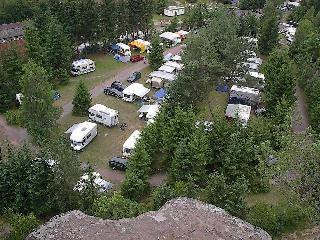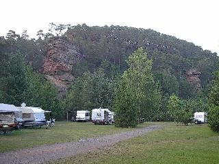 5. Etappe: Dahn / Pfalz Die fünfte und letzte Etappe führte mich - wieder mal - ins Dahner Felsenland. Der Weg dorthin war nur ein Katzensprung - schon um 11:00 Uhr war ich da. Der Campingplatz Dahn liegt sehr schön in einem felsengesäumten Tal direkt gegenüber dem Felsenland-Badeparadies. Natürlich bekommen die Camping-Gäste verbilligte Eintrittskarten. Und so verbrachte ich den Nachmittag wiedermal im Wasser. Das Restaurant am Platz bietet griechische Speisen vom Holzkohle-Grill, wovon ich mich dann abends auch anlocken ließ. Hier ein paar Bilder vom Platz: